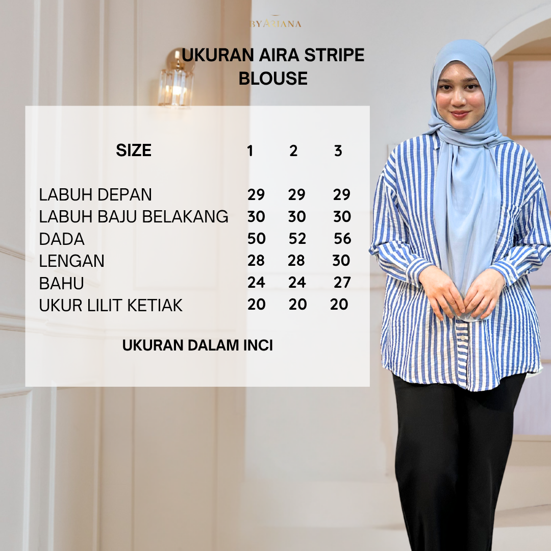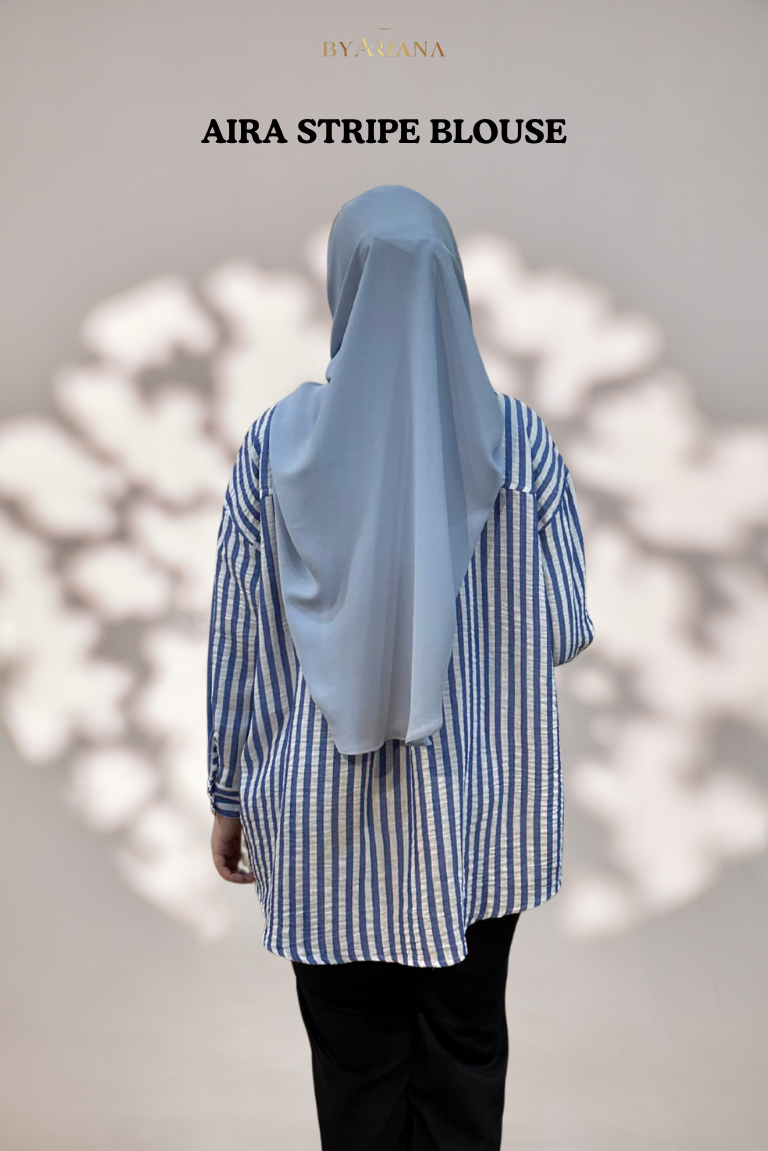 - Aira Stripe Blouse adalah pilihan yang tepat untuk mereka yang mencari blouse yang sederhana tetapi menarik. Ia boleh dipadankan dengan pelbagai jenis Seluar atau skirt.